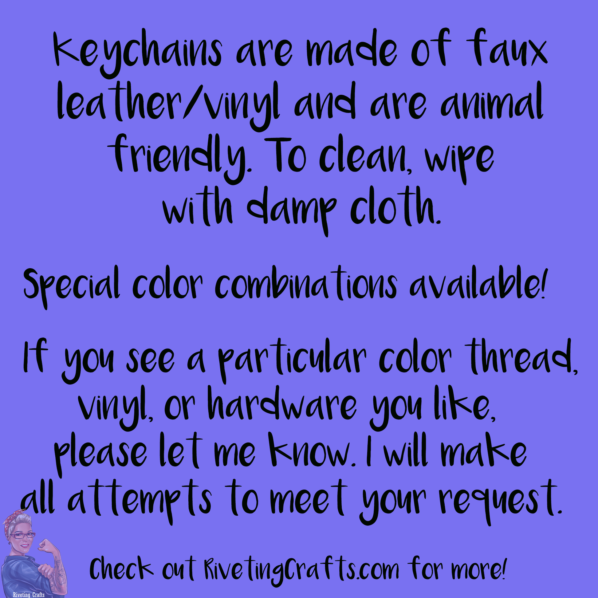 This keychain can be made on your choice of colored vinyl with black vinyl on the reverse side. Depending on vinyl color, thread colors may change for aesthetics. If no color is noted, it will be made with colors similar to first picture shown.
